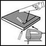 Разметить линию распила карандашом по лицевой стороне столешницы при использовании ручной пилы, по нижней стороне – при использовании механической пилы.